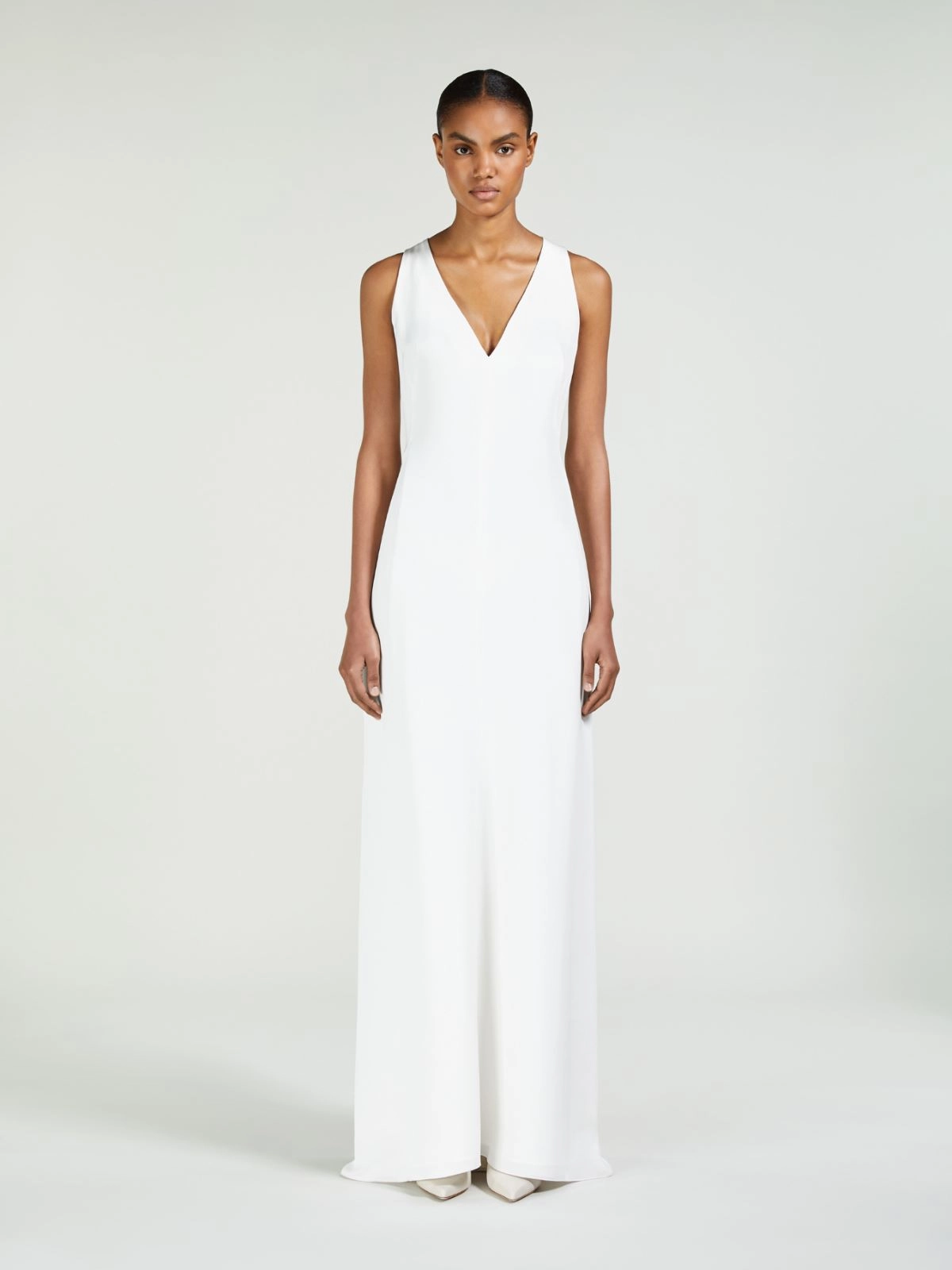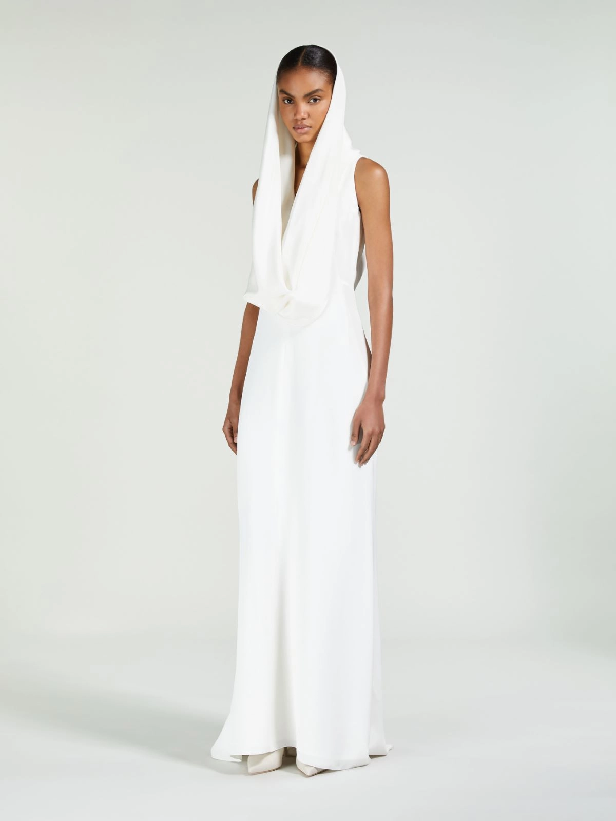 Long sleeveless dress with a large infinity stole to be worn around the neck or to create a soft hood draped over the head.